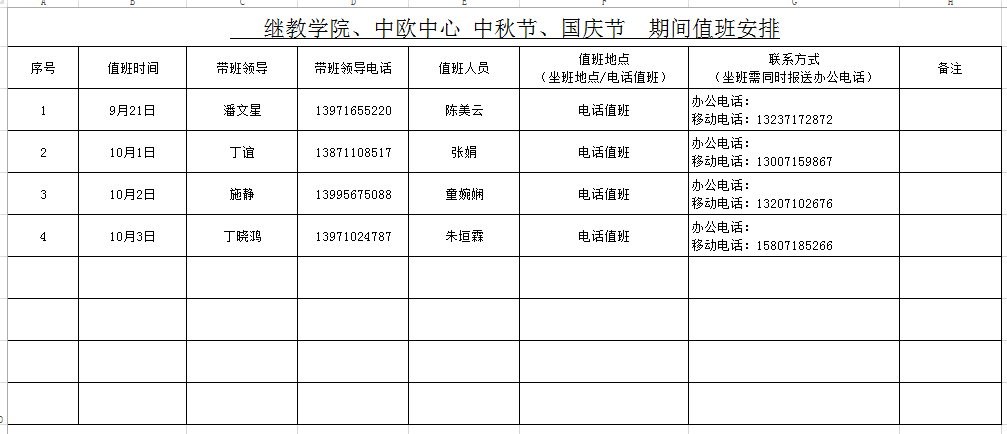 继教学院、中欧中心中秋节、国庆节期间值班安排
