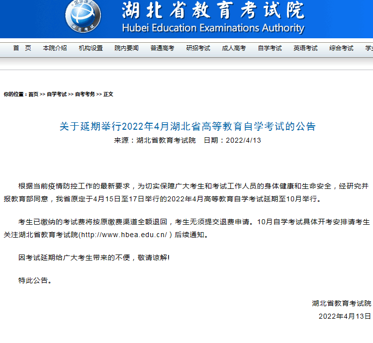 关于延期举行2022年4月湖北省高等教育自学考试的公告
