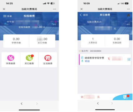 3.登录后出现校园缴费界面,提示待缴款金额,点击有提示的“其他缴费”项目,进入其他缴费界面,显示当前欠费金额,可查看具体批次号和费用明细。