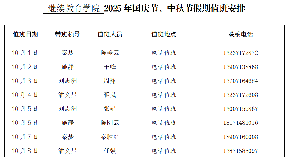 williamhill官网2025年国庆节、中秋节假期值班安排