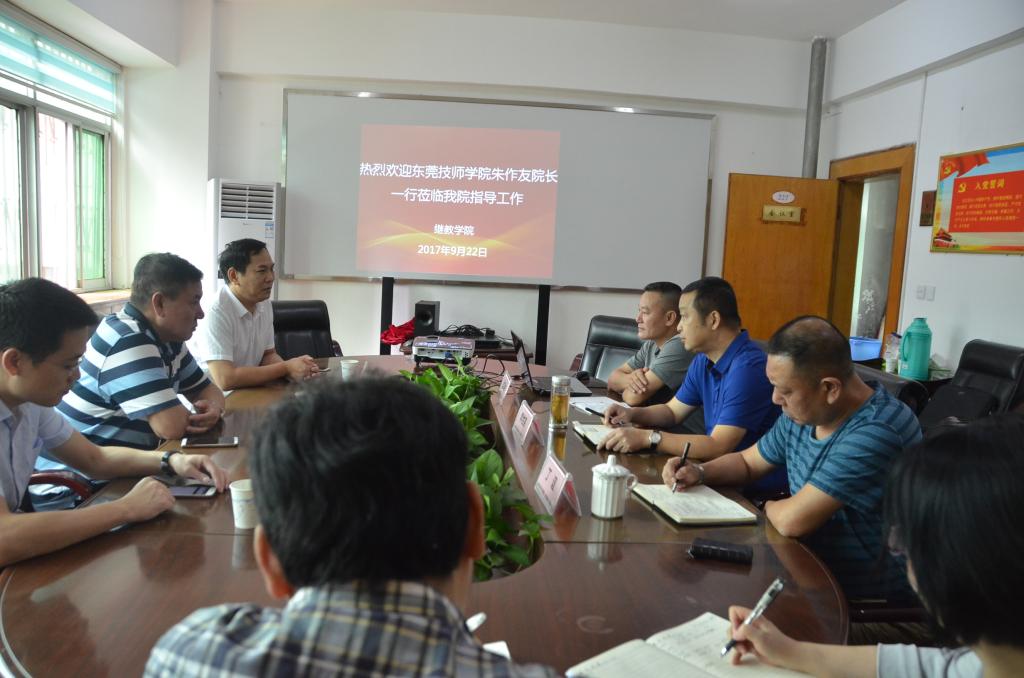 9月22日上午,东莞市技师学院副院长朱作友带领院竞赛办、继续教育中心负责人来我院进行合作交流,我院院长李世宗、分党委书记丁谊、副院长潘文星出席了座谈会。