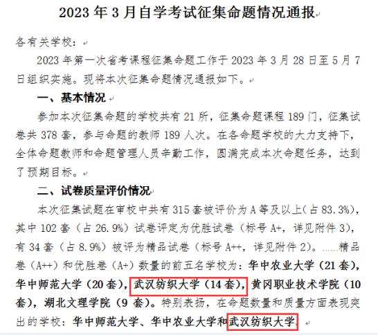 近日,湖北省教育考试院发布了《2023年3月自学考试征集命题情况通报》,对2023年第一次省考课程征集命题情况进行了通报,对试题命制中的问题进行了分析。在这次命题审核中,我校精品卷(A++)和优胜卷(A+)在数量上名列第三,尤其是在命题数量和质量方面表现突出,得到了省教育考试院特别表扬。