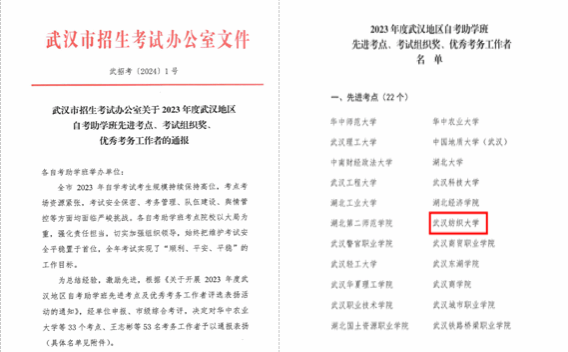近日,武汉市招生考试办公室发布了《关于2023年度武汉地区自考助学班先进考点、考试组织奖、优秀考务工作者的通报》(武招考〔2024〕1号),我校被评为自考先进考点,继教学院张娟同志被评为优秀考务工作者。