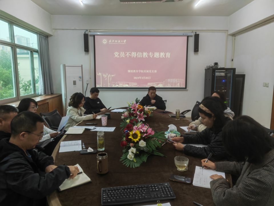 3月25日上午,williamhill官网在东湖校区行政楼512会议室召开党员不得信教专题教育暨支部主题党日活动,会议由直属党支部书记秦梦主持,支部全体党员参加会议。