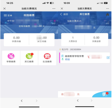 第三步:登录后出现校园缴费界面,提示待缴款金额,点击有提示的“其他缴费”项目,进入其他缴费界面,显示当前欠费金额,可查看具体批次号和费用明细。