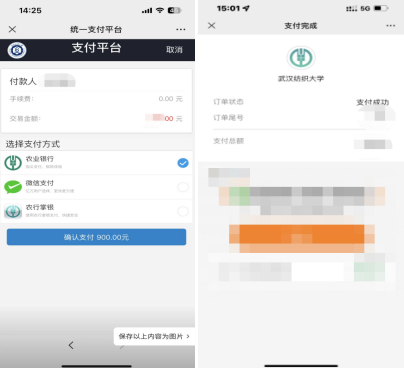 第四步:点击右下方的“缴”字,可进入支付平台(目前仅支持微信支付、农业银行和农行网银支付),确认支付即可。缴费后可自行下载电子发票。