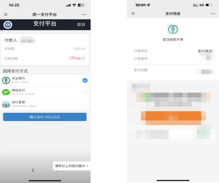 4、点击右下方的“”字,可进入支付平台(目前仅支持微信支付、农业银行和农行网银支付),确认支付即可。缴费后可自行下载电子发票。