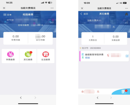 3、登录后出现校园缴费界面,提示待缴款金额,点击有提示的“其他缴费”项目,进入其他缴费界面,显示当前欠费金额,可查看具体批次号和费用明细。